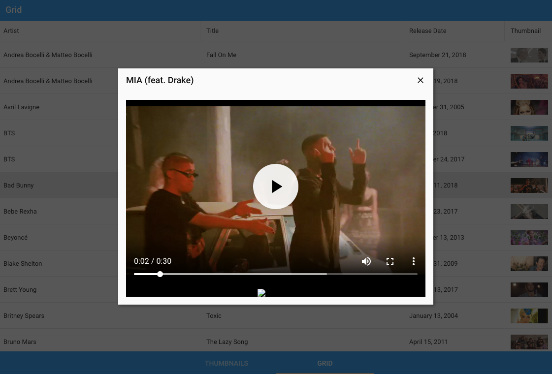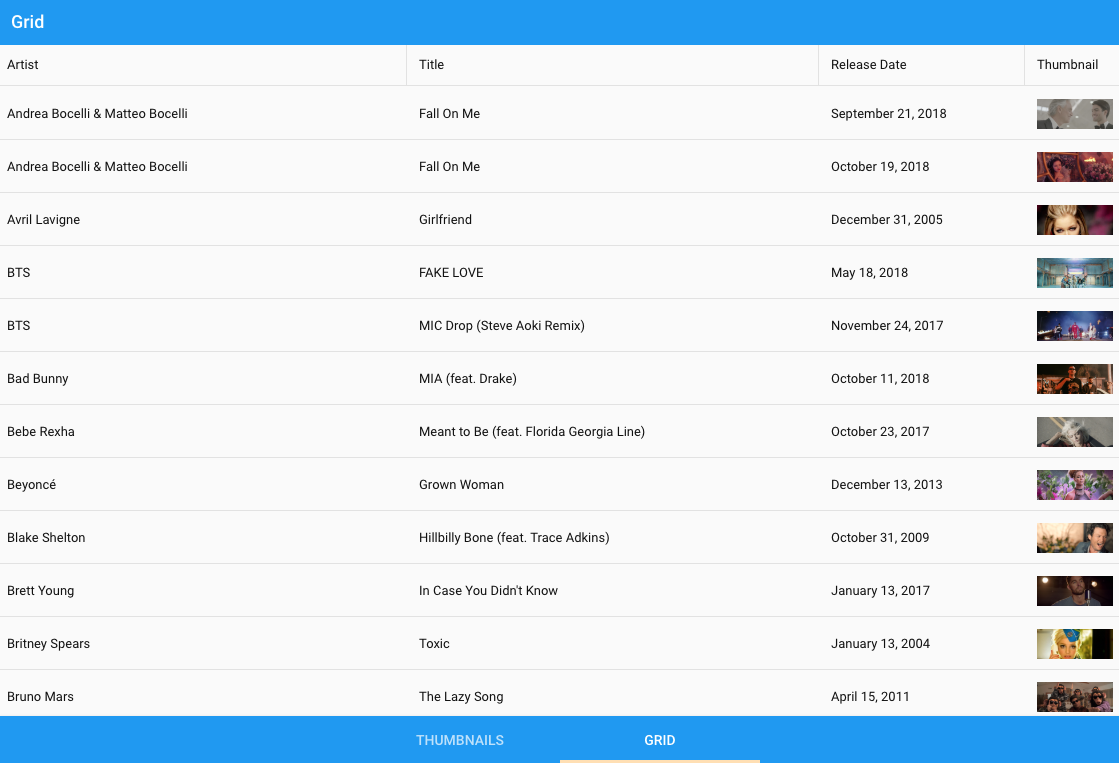 Great! Now you should have an app with a custom music video preview player that will draw data from a public data feed from the iTunes website, specifically the top videos of latest period rating. Your app should have following views