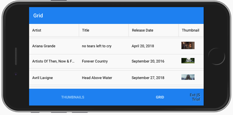 Grid with the xtype assigned to the TuneGrid class, called tunesgrid. xtype: 'tunesgrid',