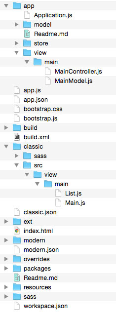 Ext JS applications follow a unified directory structure that is the same for every app. In our recommended layout, all Store, Model, ViewModel, and ViewController classes are placed in the app folder (with Models placed in the model folder, Stores in store, and ViewModels/Controllers in view). Best practice will be to logically group ViewControllers and ViewModels together in sub-folders within the app/view/ folder using a similar naming structure that you'll use for the views themselves (see the "app/view/main/" and "classic/src/view/main/" folders below).