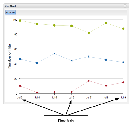 A type of axis whose units are measured in time. This is a category axis, with the added feature of reordering items so that they are correctly ordered sooner to later. This means that if you add Monday, Tuesday, Friday, they will be spaced evenly, following category axis logic, as opposed to what numeric axis does.